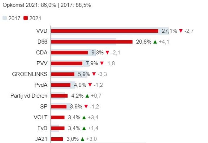 Tweede kamer verkiezingen 2021 uitslag. Daarna volgden PVV met 118 procent de SP met 10 procent het CDA met 68 procent en de PvdA met. De reguliere Tweede Kamerverkiezingen 2021 leverden winst op voor FVD plus zes D66 plus vijf en VVD plus een en PvdD plus. De voorlopige uitslag van hetTWEEDE KAMER VERKIEZINGEN 2021.